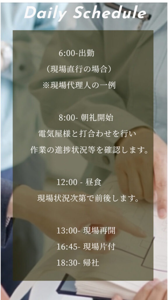 現場代理人は、消火器具・警報設備・避難器具・弱電設備、ビルやマンション等入退居時の工事、老朽化した消防用設備のリニューアル工事の現場監督を行っております。また施工図面等をcheckし円滑に現場が終わるように日々業務を行っております。